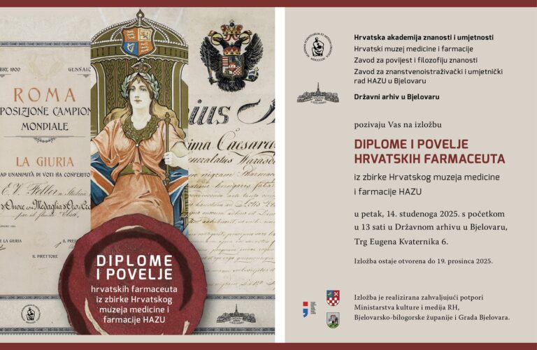 Izložba Diplome i povelje hrvatskih farmaceuta iz zbirke Hrvatskog muzeja medicine i farmacije HAZU, izvorno postavljena u Gliptoteci HAZU 2019., …