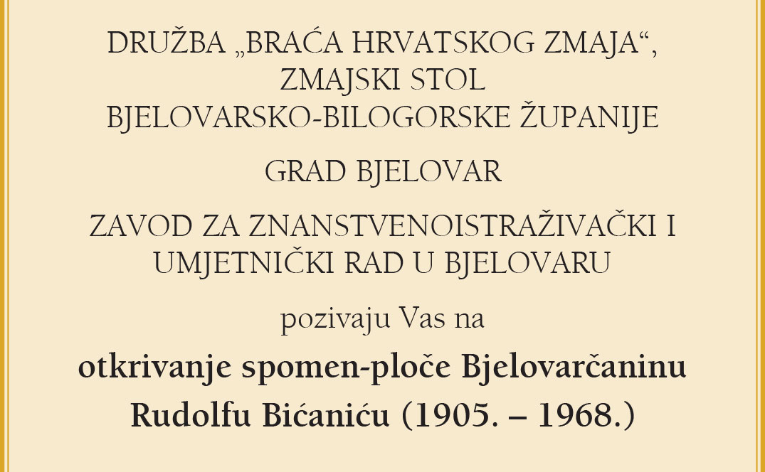spomen-ploče Bjelovarčaninu Rudolfu Bićaniću u organizaciji Družbe „Braća Hrvatskog Zmaja“ –